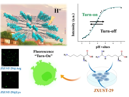 发光金属有机框架(LMOF)是一类由金属离子和有机配体组成的新型发光材料。LMOFs由于其柔性多孔结构、多个发光响应位点以及在生物环境中的突出特性,被广泛应用于爆炸物、有机小分子、金属离子、氨基酸和抗生素等的检测。作为荧光探针,LMOFs具有灵敏度高、选择性强、可恢复性和便利性等优点,这使它们成为检测各种生物靶标的理想工具。pH响应型MOF光学传感器可以通过碱性、酸性或氢键位点精确响应pH值波动。然而,pH响应型MOFs或COFs的研究和开发目前处于起步阶段。因此,开发基于MOF的自校准pH传感器来检测pH波动具有重要意义并具挑战性。