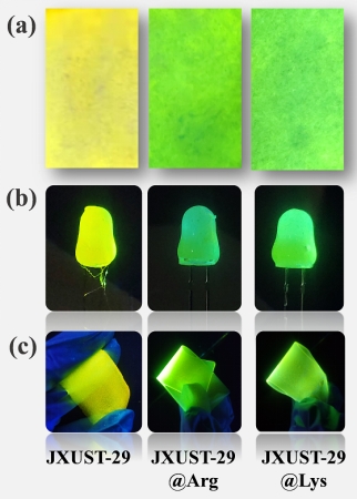 图3 (a)JXUST-29、JXUST-29@Arg和JXUST-29@Lys在波长为365 nm的紫外光下的荧光试纸。(b)在365 nm激发下涂有JXUST-29、JXUST-29@Arg和JXUST-29@Lys的LED灯;(c)在365 nm的紫外光下基于JXUST-29、JXUST-29@Arg和JXUST-29@Lys的复合膜。