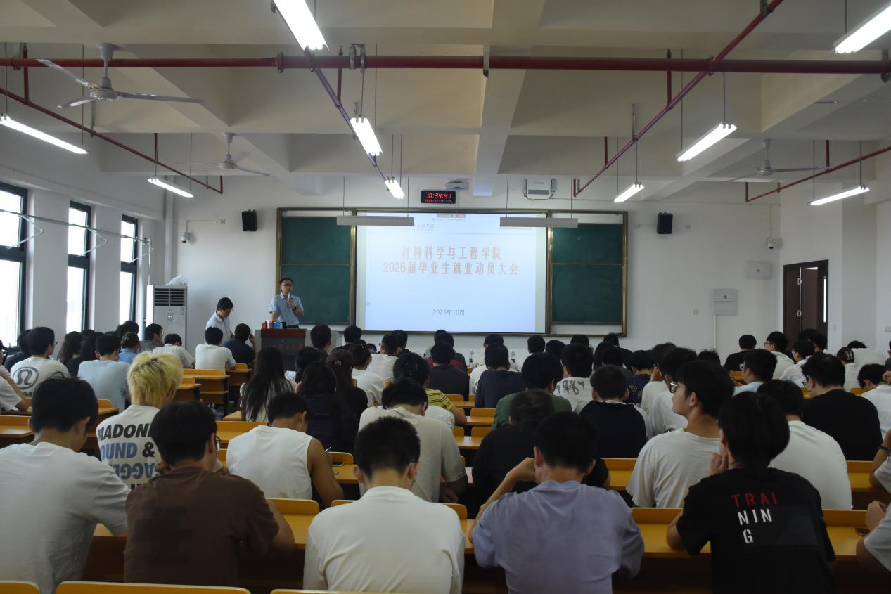 本网讯 为引导毕业生了解当前就业形势,树立正确的就业观念,有序推进2026届毕业生高质量就业工作,近日,材料科学与工程学院在三江校区西园阳明楼举行2026届毕业生就业动员大会,本次会议同时设立线下主会场和线上分会场。学院党委副书记丁能文、就业辅导员黄松炜、毕业班辅导员魏志成及全体2026届毕业生(含联合培养毕业生)参加会议,本次动员会邀请到学校招就处就业科郭传州和党委武装部、保卫处朱元峰2位老师,会议由黄松炜主持。